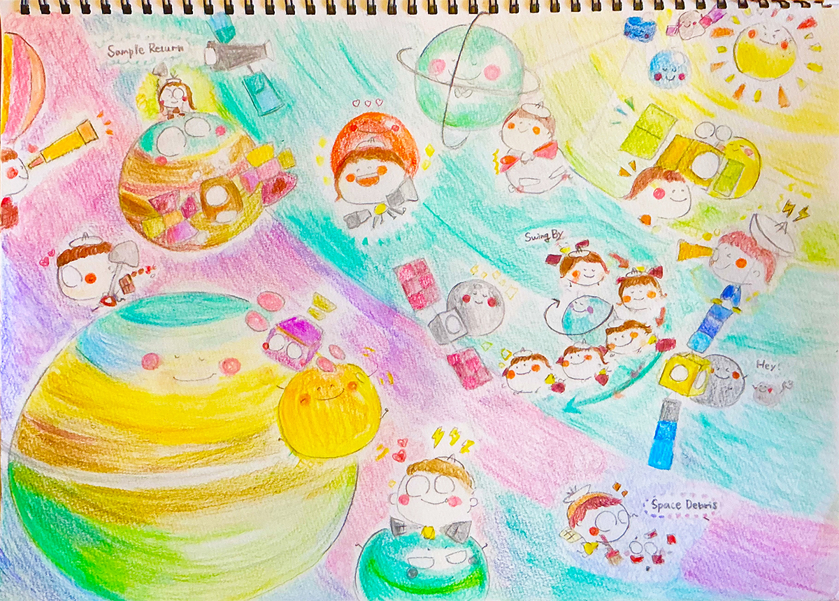 はい!私は絵を描くことが大好きなので、宇宙開発に関する絵本を作りたいと考えています。絵本は惑星や天体の特徴を正確に捉え、多くの知見を得られるもの、また美しい挿絵がたくさん詰まったものにしたいです。さらにハンガリー語をはじめ、様々な言葉に翻訳することで、世界中の人々に絵本を届けたいです。 小さな町ではアクセスできる情報にも限られていた経験から、今後は宇宙開発の持つ魅力や知見を世界中に届け、多くの人々が夢や目標を持つきっかけとなれば嬉しく思います。 このイラストは太陽からはじまり、水金地火木、探査機を人に見立ててアンテナやSAPをつけて、サンプルリターン、スイングバイ、宇宙デブリの回収を行う様子を描きました。