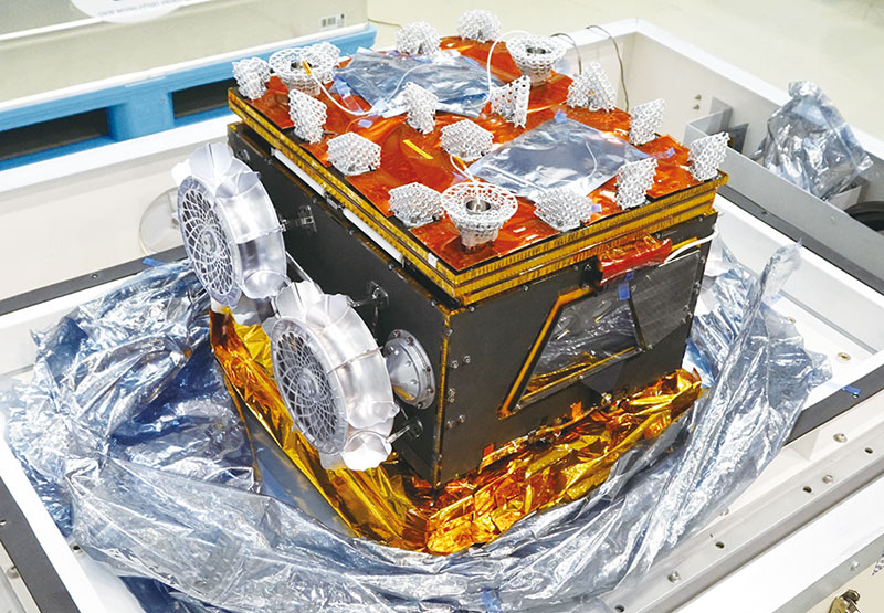 IDEFIXはローバ本体が重さ約23kg、1辺約50cmの立方体形状で探査機の大きさと比較すると小型です(図2)。フォボス表面移動や姿勢制御のために、4つの独立に動作が可能なホイールが先端についたアームを制御します。アームは本体との連結箇所が回転する仕掛けになっています。ホイールを動かすことで前進したり、アームを動かすことで高さや姿勢を変えたりすることができます。科学観測機器として光学カメラ、ラマン分光計、熱放射計が搭載されており、フォボス表面科学に資するデータも取得予定です。探査機本体には、加えて分離機構(MECSS)、ローバ通信アンテナ(RolAnt)、データ処理装置(RolBox)も搭載されます。