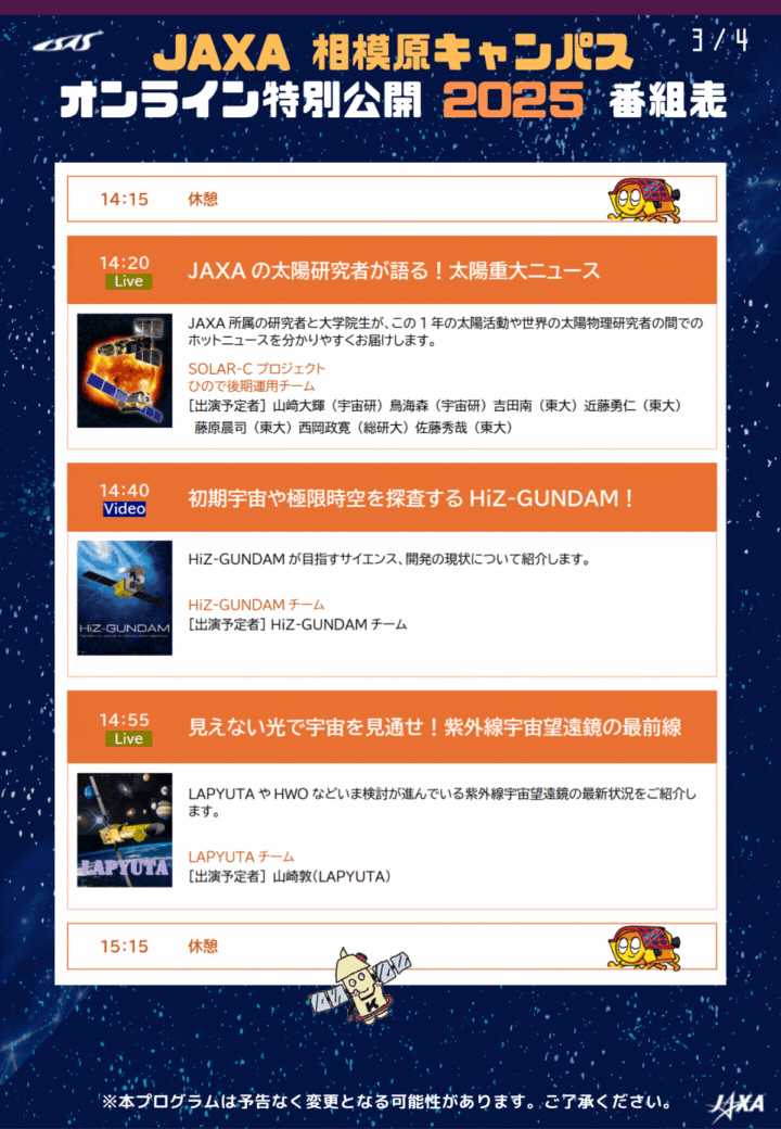 | 会場 | JAXA相模原キャンパス 相模原市立博物館 (キャンパス向かい) 国民生活センター 相模原事業所 (キャンパス正門から徒歩10分) ※プログラムの会場マップをご参照ください。 |