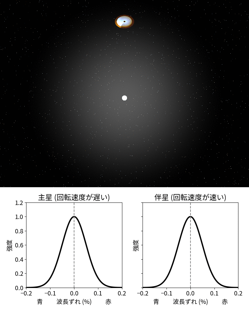 この謎を解く鍵は、「ドップラー効果」にあります。連星では、2つの星が互いの周りを回るため、それぞれの放射する光の波長がわずかに青側・赤側へと周期的にずれます。これは、救急車の音が近づくと高く、遠ざかると低く聞こえる現象と似た原理です。図2上にあるように、主星も伴星も時計回りに回転する(ただし中心からお互いに逆位置)とします。伴星の方が軽いので、動きが大きくなります。これのスペクトルを観測すると、図2下にあるように、主星と伴星からの輝線の色の変化が正反対の動きをすることが期待されます。動きの速い伴星の方が振れ幅も大きく、両者の質量の比の逆数である20倍程度になります。