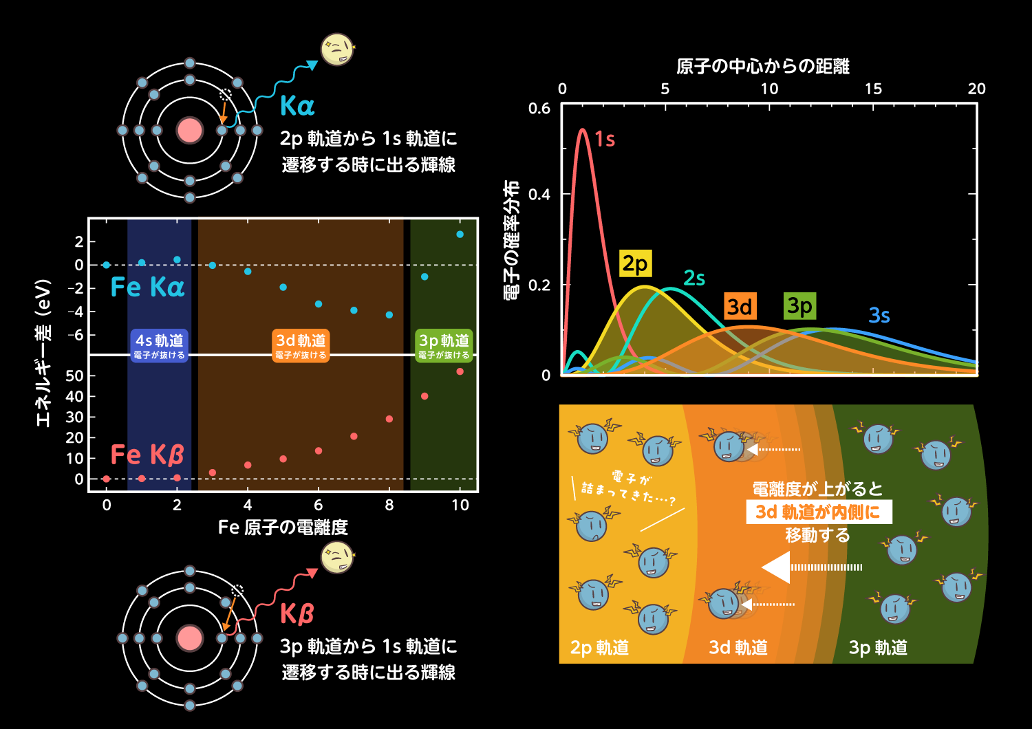 図2:(左)鉄イオンの電離度に対する、蛍光輝線のエネルギーの変化。中性鉄輝線からのエネルギー差として表記。(右上)各電子軌道の確率密度分布。(右下)鉄イオンの電離に伴う3d軌道の収縮の様子。 (クレジット: JAXA)