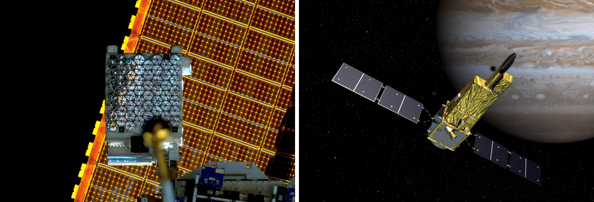 図1:今回の研究で使用された NASAのX線望遠鏡「NICER」(左)と JAXAの紫外線望遠鏡「ひさき」(右)。
